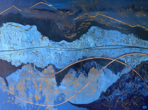 Recent works shown here were created to 14 different versions of the song made popular by The Everly Brothers titled “Let It Be Me.” Composed by Gilbert Bécaud and Pierre Delanoë, originally published in French in 1955 as "Je t'appartiens." Aside from this single musical inspiration, MuKha’s influences include not only the landscape and mountains surrounding her studio but those unseen from an internal experience.